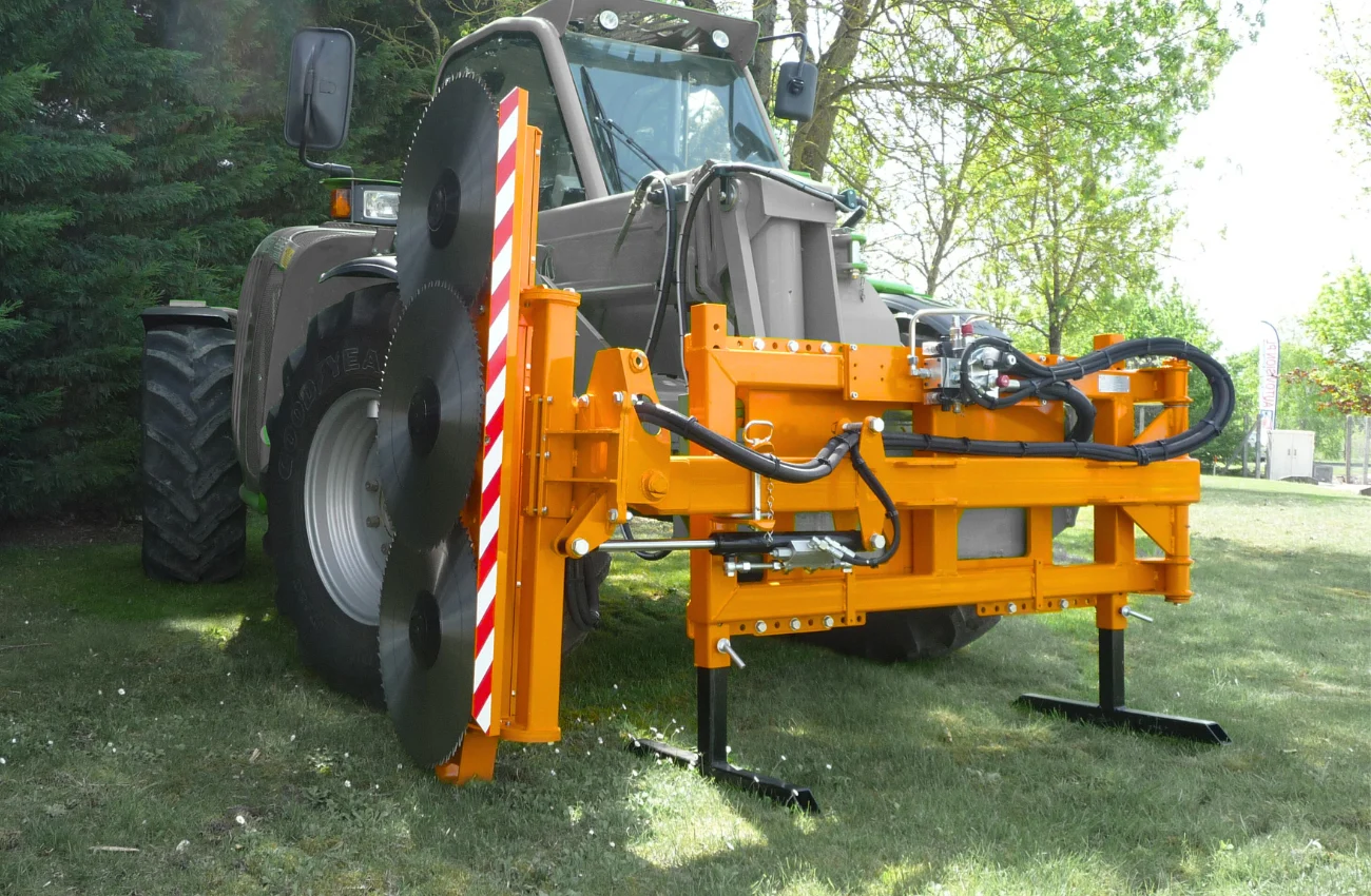 This model is appreciated for its ease of implementation: no complex articulated arm, its attachment is as easy as a bucket. It is equipped with 3 or 4 saw blades with a diameter of 600 mm, with a cutting capacity of 200 mm, sufficient for the majority of agricultural hedges. It offers excellent visibility from the cabin while protecting the carrier: the blade is kept at a distance, which limits exposure to projections and cut branches.