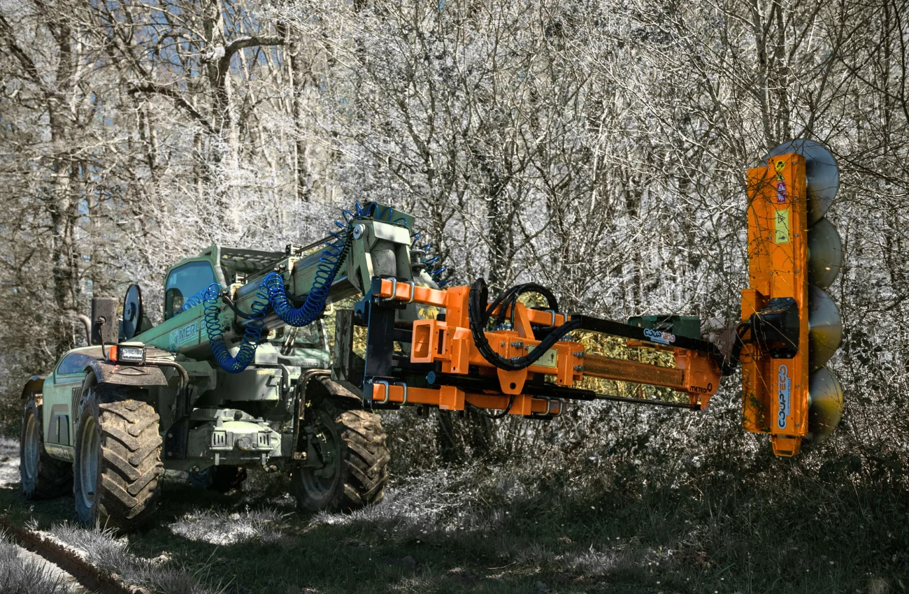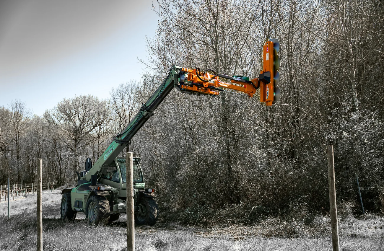 Mounted on the left side of a telehandler, it offers extra comfort: better visibility of the cutting area, fewer maneuvering constraints, and significant time savings over long stretches. This is a real advantage in everyday work, particularly for tall or irregular hedges.
