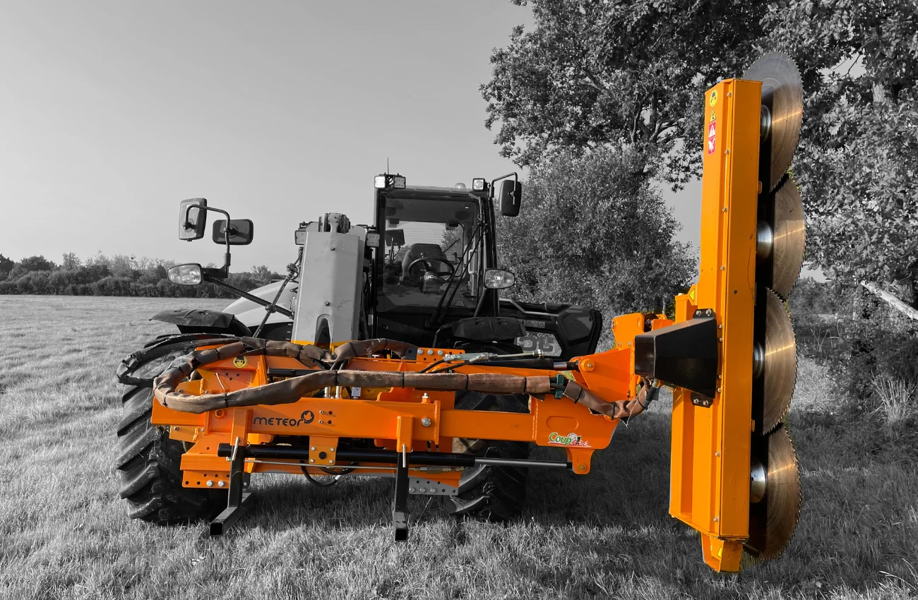 The Meteor T90C is easy to operate and highly adaptable to a wide range of situations. Its welded steel cutter bar can hold 3 or 4 blades of 600 mm diameter, capable of cutting branches up to 200 mm thick. The Poly-V 10-rib belt transmission ensures smooth and long-lasting rotation, even under challenging conditions.Powered by a hydraulic motor delivering 45 L/min at 170 bar, it maintains consistent performance even in dense vegetation. With a cutting length of up to 2 meters, it quickly covers long stretches, reducing the need for multiple passes.A 1-meter hydraulic side-shift cylinder makes lateral adjustments easy, while the tilt cylinder allows the head to pivot for horizontal cuts—ideal for topping hedges. From the cab, the operator retains full control thanks to the integrated distributor. The optional Bluetooth system eliminates cumbersome cables.When needed, the machine can be switched to flail heads for gentler trimming. Its robust construction and precise assembly guarantee long-term reliability.